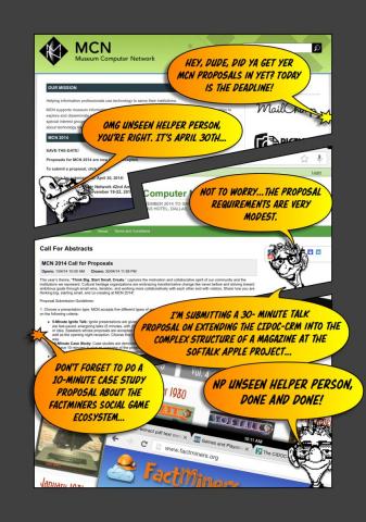 We are EXTREMELY pleased to report that BOTH our proposals have been accepted for presentation at #MCN2014! Here are our two proposals for presentations at this year's Museum Computer Network conference to be held in Dallas in November. And even better, we are so pleased to report that FactMiners' Jim Salmons has been awarded an Emerging Professional Scholarship to attend #MCN2014! We're going to Dallas! :-)