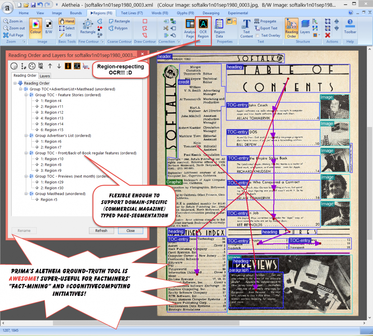 Aletheia provides flexible region (page segment) creation, including the all-important page-segment-respecting OCR feature. Bulk OCR simply produces an unstructured "text soup" in an unseen layer of, for example, an image-based PDF file. While full-text searches can be done on such bulk OCR data, the actual and all-important structure of the magazine is nowhere to be found. This is a central challenge of FactMiners' fact-mining -- typed-structure-respecting text recognition... our Holy Grail of tool requirement.