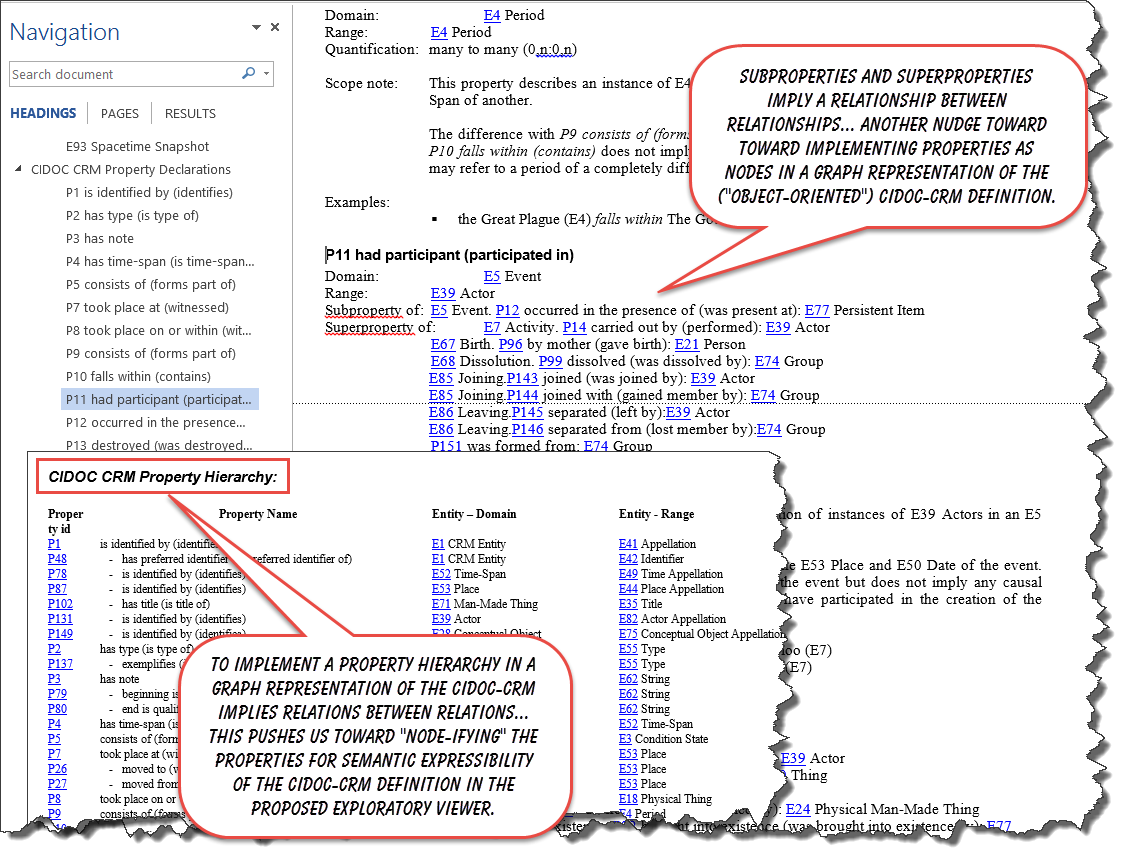 To bring the CIDOC-CRM Definition "to life" in an exploratory viewer, we'll need to provide "shortcut" (i.e. collapsed) visualizations of the model that make the resulting interactive graphical diagrams less cluttered and more intuitively meaningful.