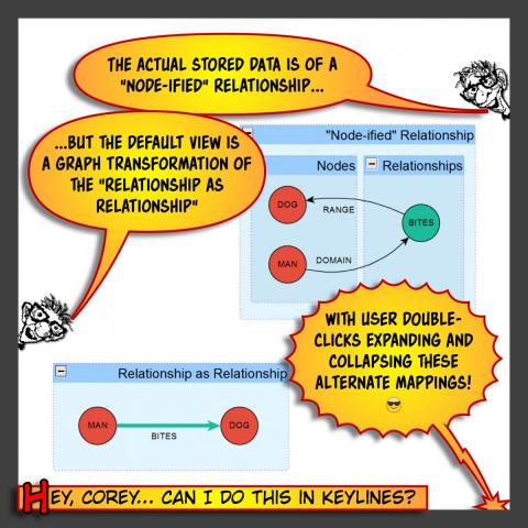 One aspect of my metamodel subgraph design pattern has to do with a graph transformation that can be viewed as "node-ifying" a relationship. That is, in order to more completely model a relationship in a target graph, we explicitly model the target relationship as a node in our metamodel. I think of this transformation as an elementary "2-dimensional hypergraph" in that the "node-ified" relationship and its domain and range relationships are a subgraph decomposition of the target graph's relationship. The cartoon graphic accompanying this post more easily demonstrates this mapping/transformation.