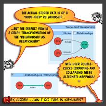 One aspect of the metamodel subgraph design pattern we are using for the FactMiners Fact Cloud is a graph transformation that can be viewed as "node-ifying" a relationship. That is, if our source database has a relationship, we model the relationship as a node in the metamodel so we can more fully model the relationship. In this post I explore an aspect of the UI view of such an approach and wonder if Structr and KeyLines could be used to create an intuitive and easy-to-use visualization of such a dynamic graph transformation at the view level. My particular interest here is use this design pattern to create a Neo4j-based exploratory viewer on the CIDOC-CRM.